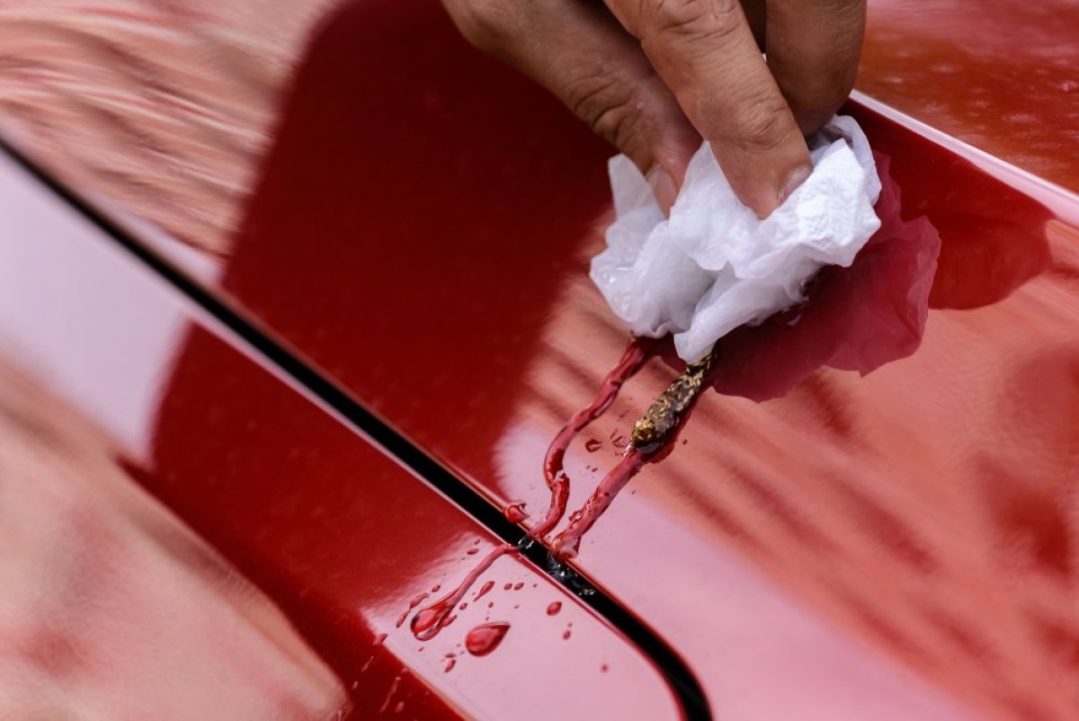 Poprskajte ptičiji izmet vodom ili sprejom. Bitno je da se ne pokušava suvo brisanje, jer to može izgrebati lak. Preko toga stavite papir.