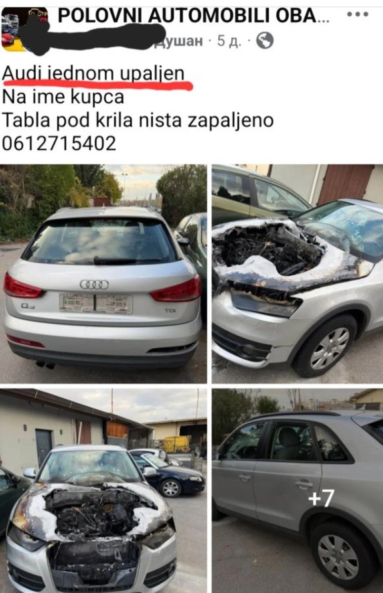 "Audi jednom upaljen", piše u prvoj rečenici oglasa, a na fotografijama se jasno vidi potpuno izgorela hauba. Kako je naveo, cena ovog automobila iznosi 5.900 evra.