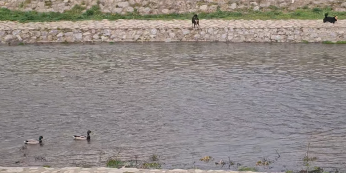 Preko puta njih plovile su dve divlje patke. Naizgled, kao da ih glasno lajanje pasa nije uznemiravalo.