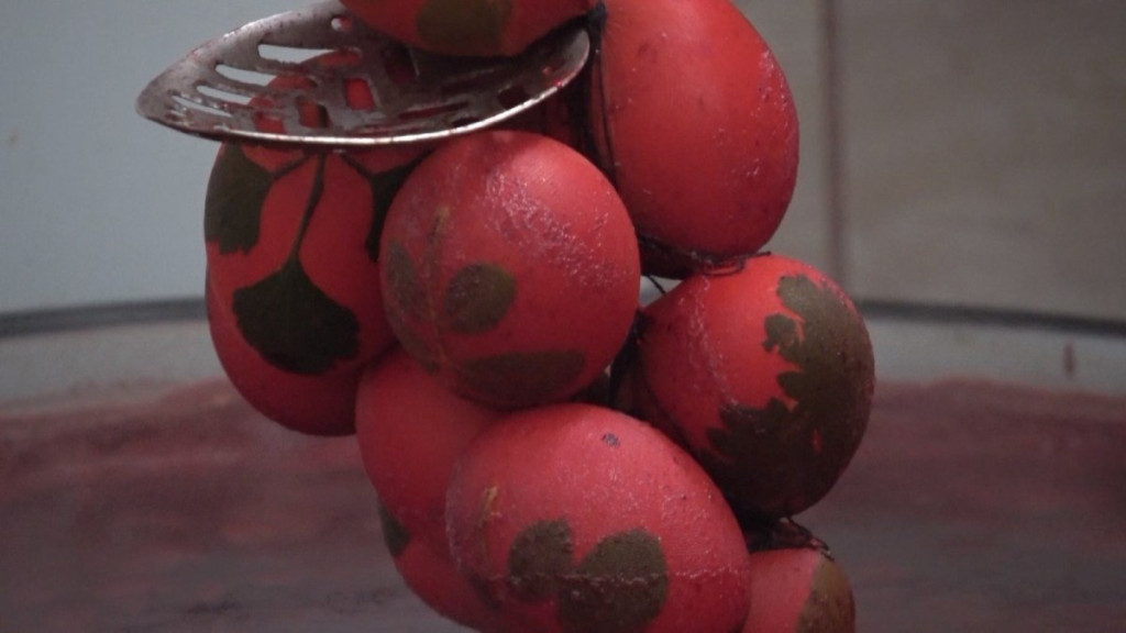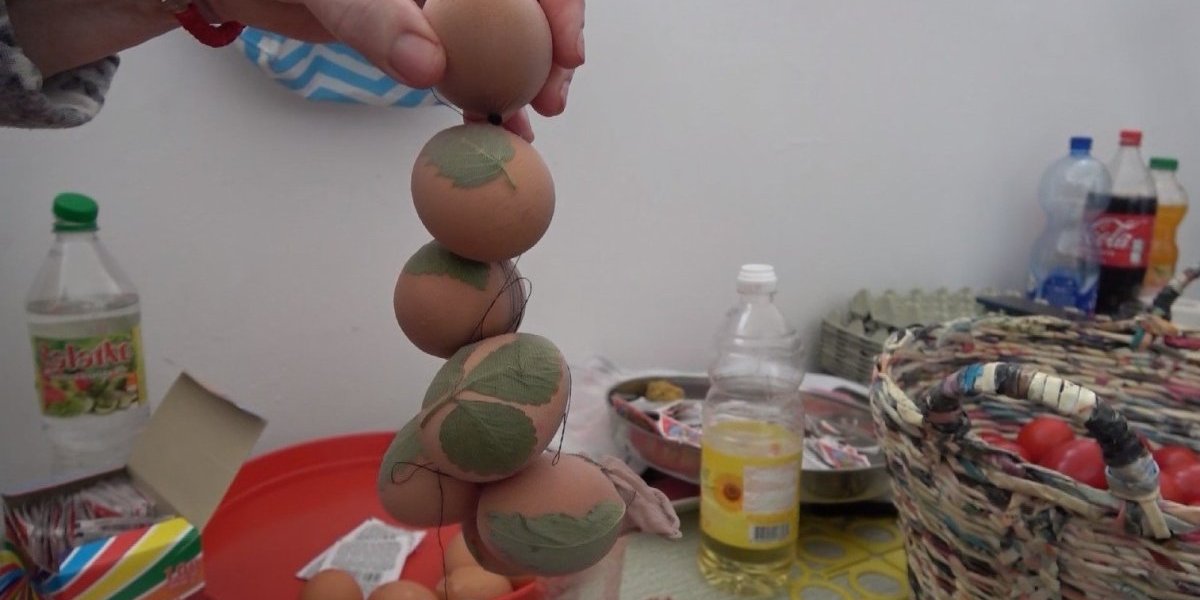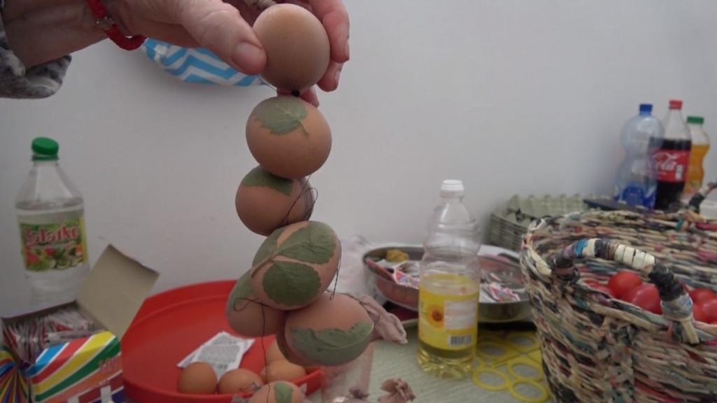 - Vezujemo jaja u čarape, kao u grozdove. Isključivo ih farbamo u crvenu boju. U čarape se stavlja trava i čvrsto se veže, kako se listovi ne bi pomerali, a šare da ostanu - objašnjava Radojka Biber, iz ovog udruženja.