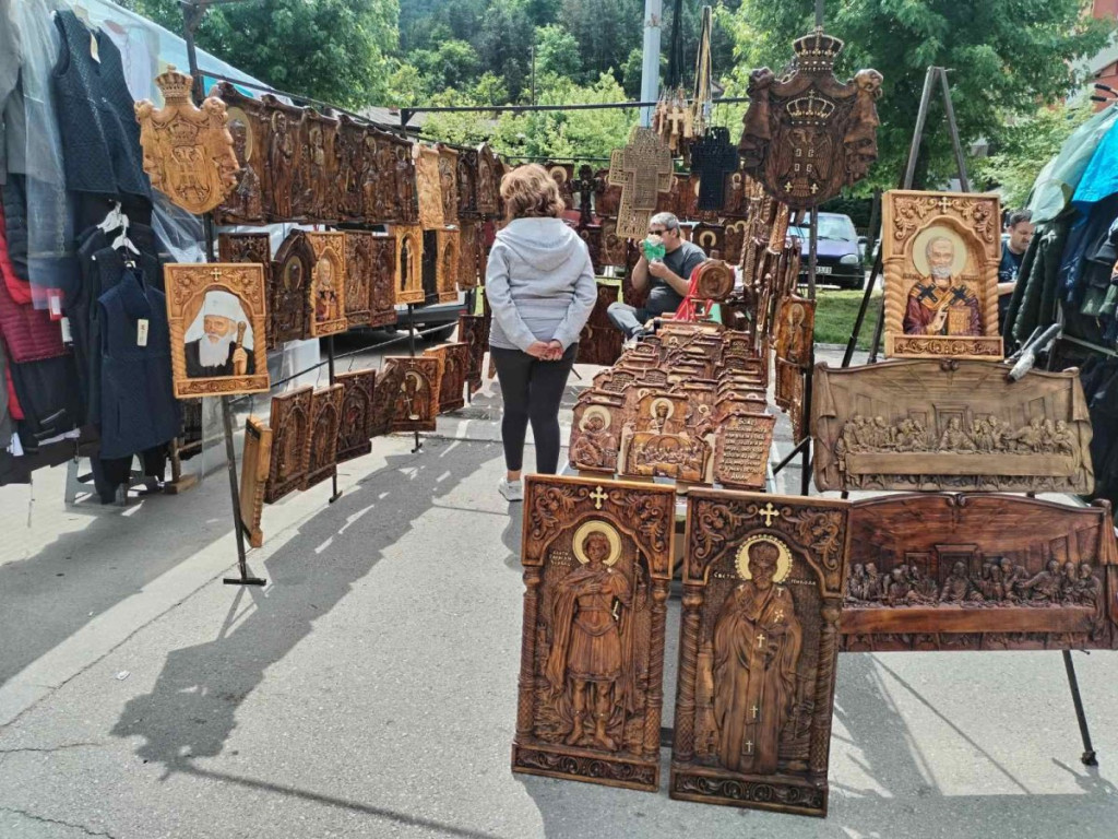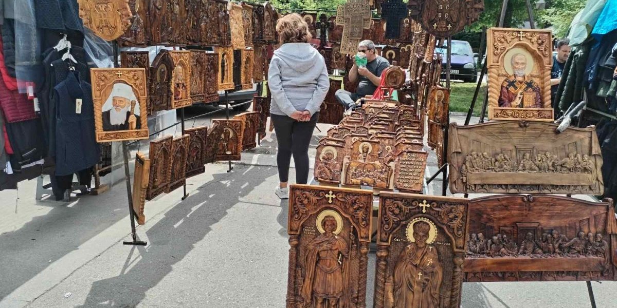 - Iz Kraljeva smo. Muž ih radi, a ja crtam. Ove ikone srednje koštaju od 4.000 dinara, ove veće 6.000, a ovi mali napisi i ikone koje se kače na zid su po 1.500 dinara. Često njih kupuju kao poklone - kaže prodavačica.
