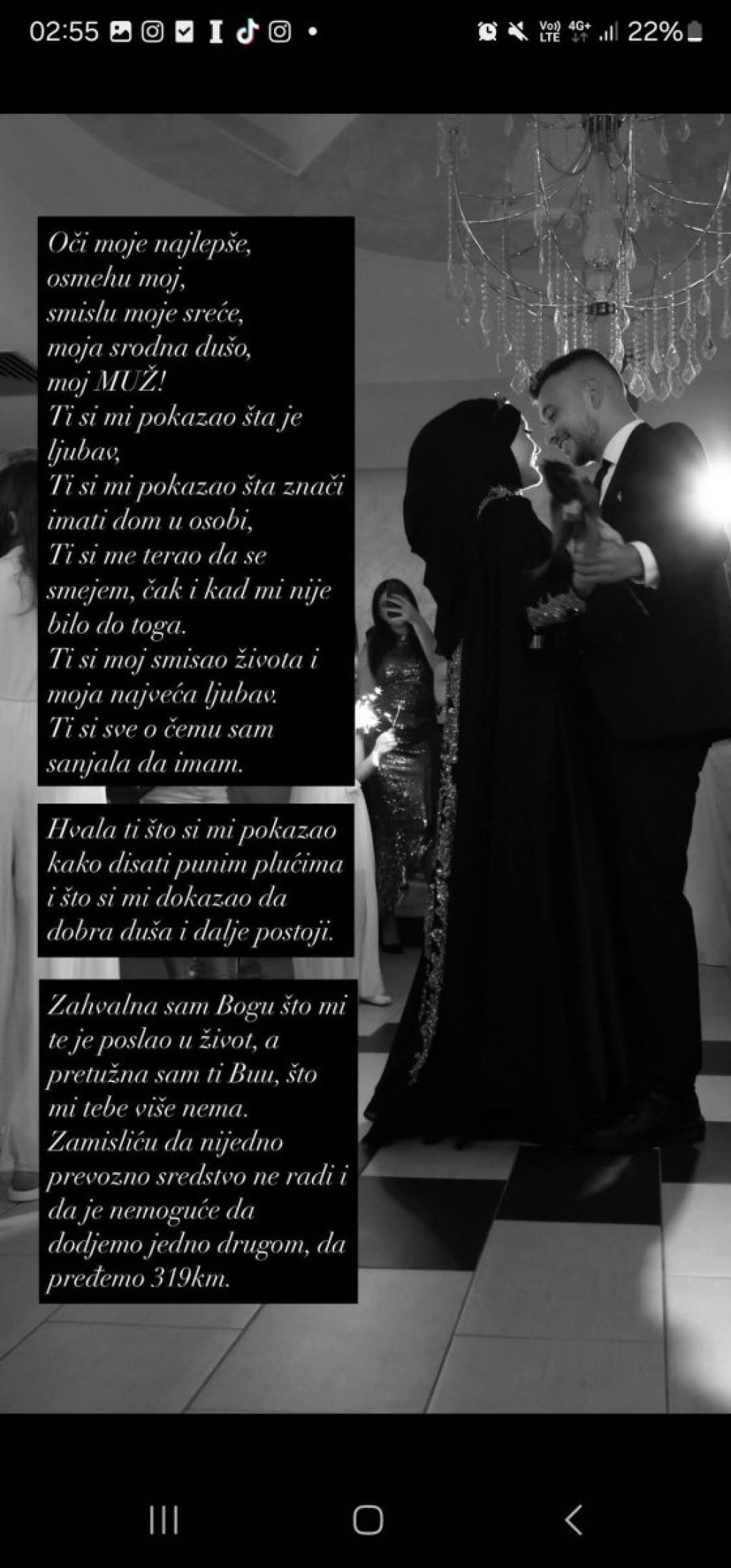 “Nestrpljivo sam čekala 9. avgust, dan naše svadbe. Ja sam tebe već gledala kao svog muža. Preteško mi je i nedostaješ mi neopisivo. Čekaj me... Volim te.”