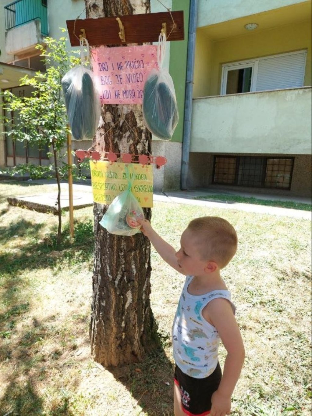- Svako ko prođe može da uzme ono što mu je potrebno a oni koji imaju viška ili žele da pomognu mogu da ostave za druge - skromno kaže Aleksandra dok njen mali asistent objašnjava šta se sve tu nalazi.