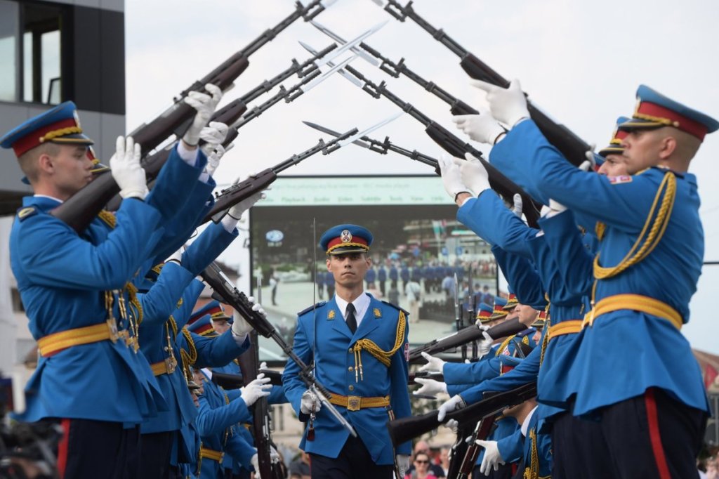 Uz zvuke Pešadijskog marša, na oduševljenje okupljenih građana kod Spomenika kosovskim junacima, pripadnici Garde izveli su egzercir pod komandom potporučnika Đorđa Pešića. Plavi stroj je demonstrirao strojeve radnje sa oružjem, a atraktivna koreografija, spretnost i skladnost pokreta gardista nagrađeni su gromoglasnim aplauzom.