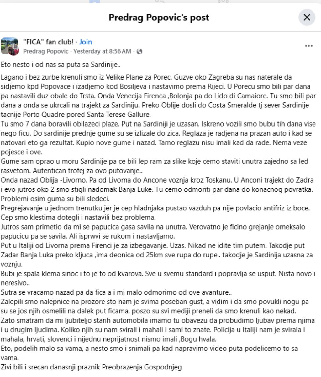 Sveštenik je na društvenoj mreži Fejsbuk objavio post u kojem je opisao kako je izgledalo putovanje na more iz Velike Plane sa njihovom Fićom, a opisao je i nekoliko poteškoća sa kojima su se susreli.