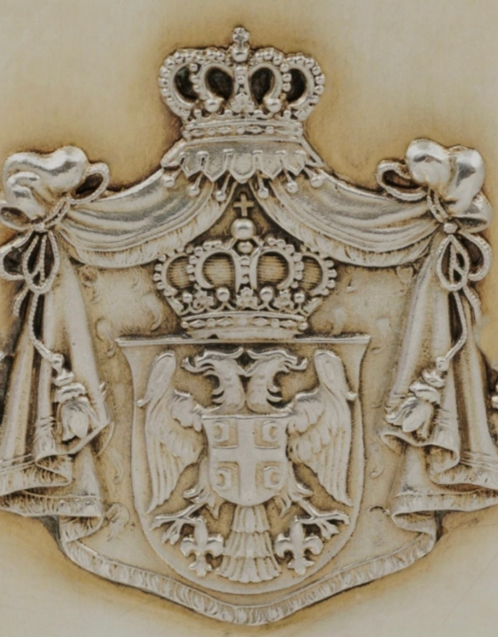 Posebnu vrednost predmetu daje grb Kraljevine Srbije, izlivan u srebru, koji se nalazi na podnožju svećnjaka.