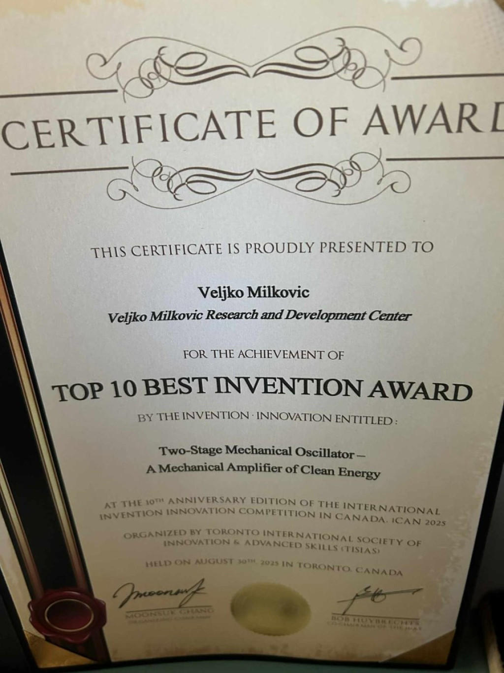- Ovo priznanje je ne samo za mene, već i za sve one koji su podržvali ovaj izum prethodnih godina – navodi Veljko Milković, autor 120 pronalazaka i 30-ak odobrenih patenta. To je veliki uspeh i za sve profesore, naučnike, istraživače, sve dobronamerni ljude, a ima ih dosta, koji su "hladne glave" hteli da razmotre ovaj naučni fenomen i potom bili hrabri da daju pozitivno mišljenje verujući u održivu budućnost zasnovanu na čistim tehnologijama kao što je dvostepeni oscilator – naglašava naš pronalazač, koji ove godine obeležava prvih 70 godina stvaralačkog rada, koje su iznedrile brojne izume koji su našli primenu od Amerike do Azije.