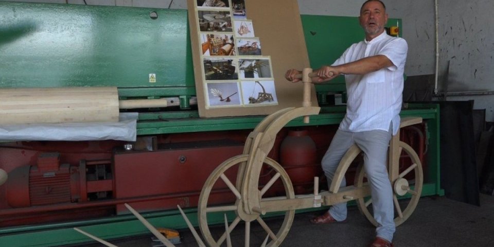 - Ne koristim savremene mašine, jer želim da osetim kako su se u ono vreme ljudi borili i radili da saviju drvo, zalepe, kanapima vezuju materijale. A to što su imali, savršeno su upotrebljavali i stvarali. Za sada sam napravio Ikarovo krilo, muzičku kutiju, tu je i preteča Ikarovog krila, mehanički udarni čekić i čuveni Leonardov drveni bicikl koji ću provozati ulicama Kikinde. Nadam se da me saobraćajci neće zaustaviti da traže serijski broj bicikla - priča u šali Brkin, dok pokazuje početak stvaranja prototipa helikoptera po Leonardovom nacrtu.
