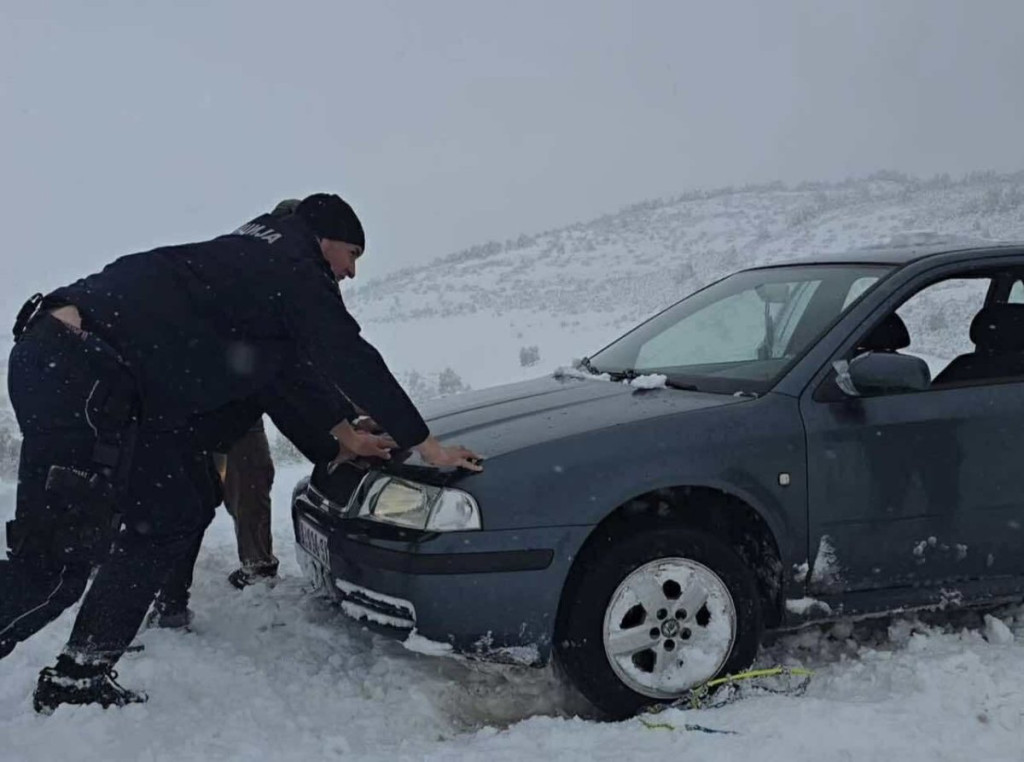 Na putu Naboje – Ervenice kod Tutina sneg je izazvao haos, a vozači ostali zavejani. Policijski službenici Elvis B. i Elmedin P. koji su se vraćali iz treće smene sa GP Gostun pritrčali su u pomoć vozačima.