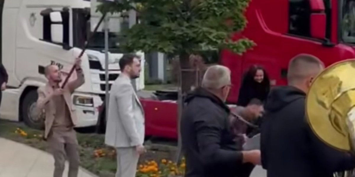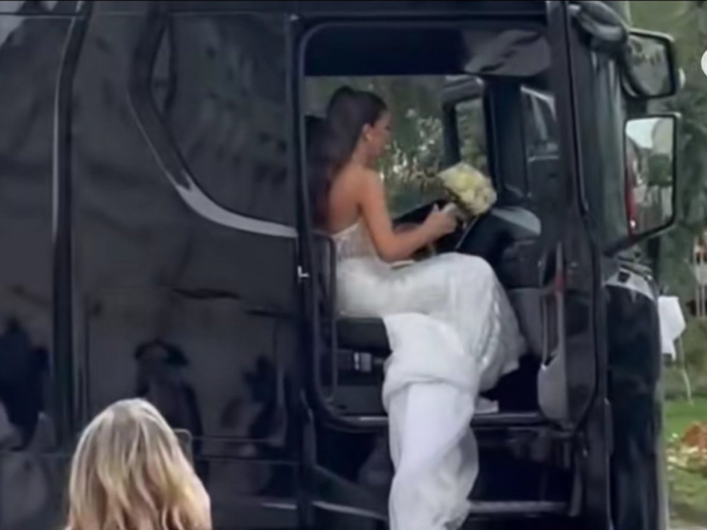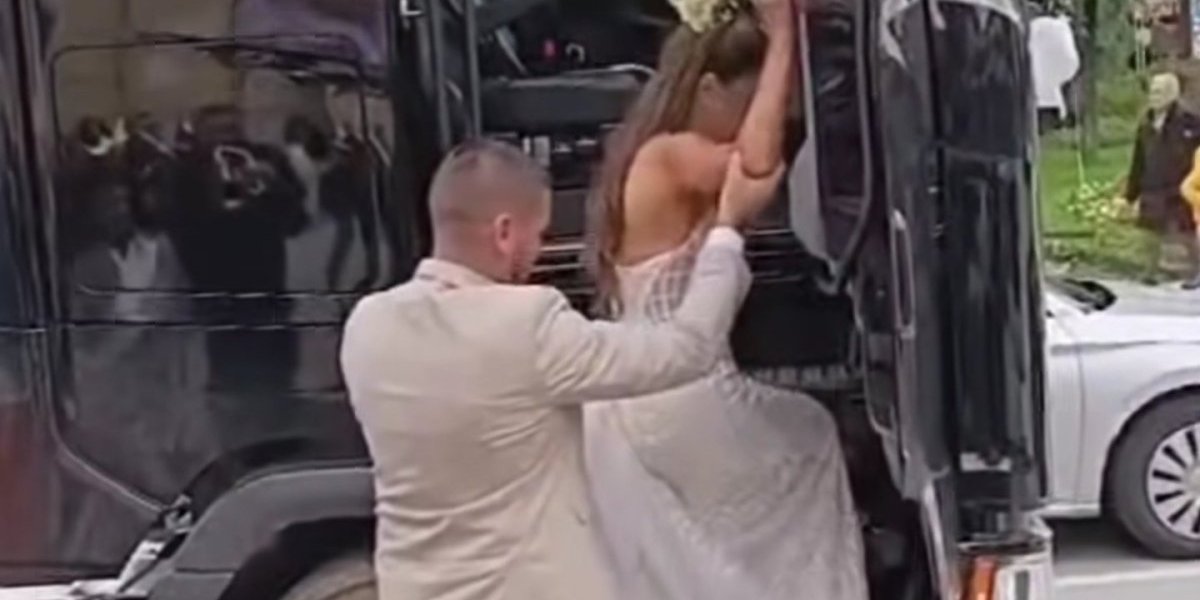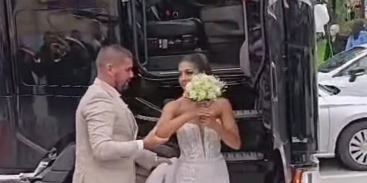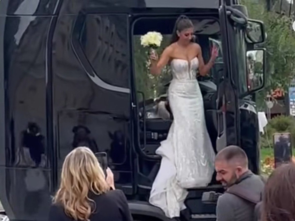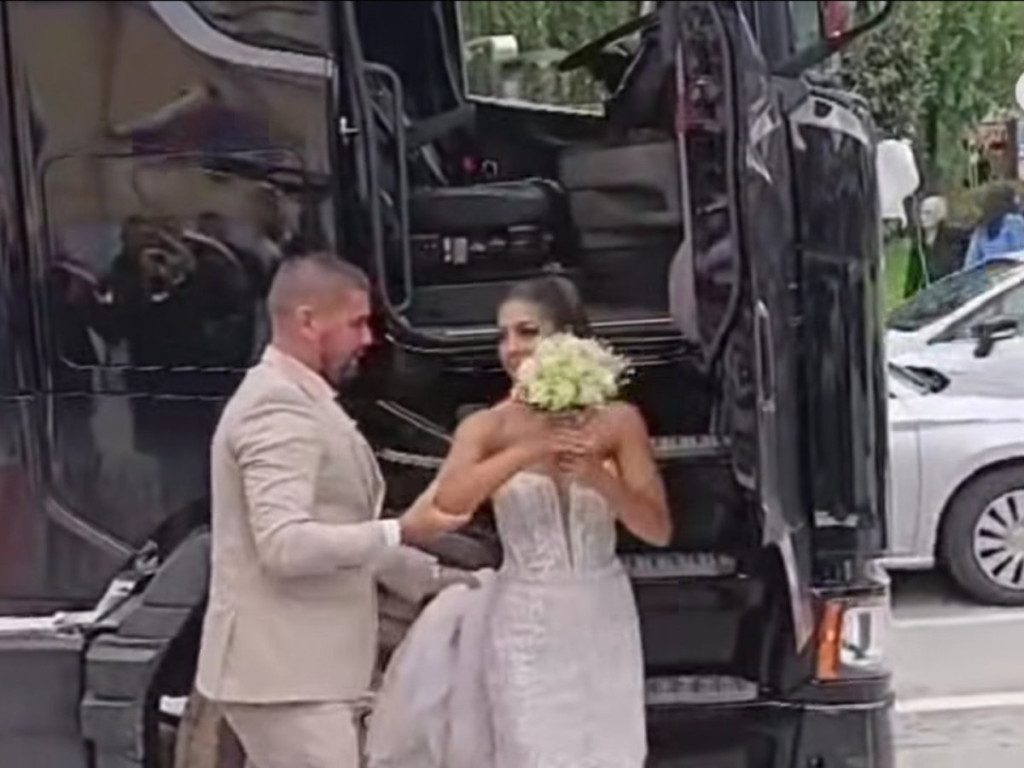 Dok je mlada stajala u kamionu pored otvorenih vrata i cupkala uz trubače, Nemanja je izašao iz kamiona i pomogao svojoj izabranici da siđe.