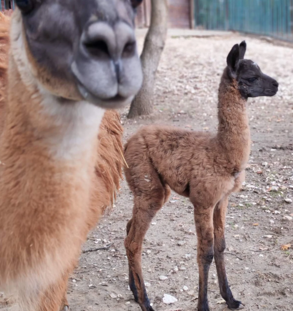 Mladunče lame već sedi pored majke, a sudeći po fotografiji, čini se da je poslušno.