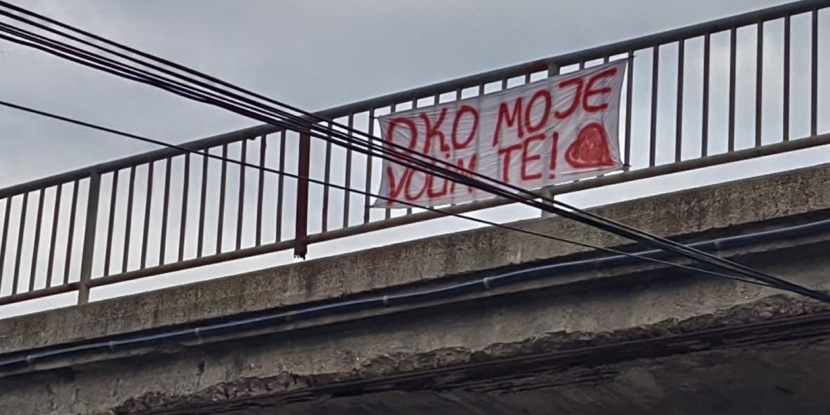 Na belom platnu crvenom bojom ispisano je "Oko moje volim te". Ko je autor i kome je poruka namenjena, ne zna se, ali je sigurno da to "oko" mora da je vidi i kad ide iz grada i kad se vraća.