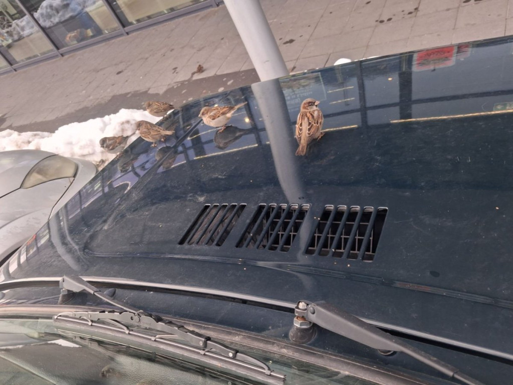 Možda i zbog hladnoće, u jednom trenutku doleteli su na haubu jednog automobila, ispod koje je dopirala toplota tek ugašenog motora, pa dok se vozač nije vratio iz prodavnice, uživali su u toploti.