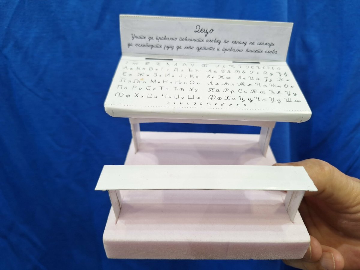 - Predlažem da se napravi skamija od metala i da se na njoj urežu slova kako bi deca, povlačeći olovkom ili prstom kroz te kanale vežbala da savijaju ruku pravilno i tako naučila da lepo pišu. Ta klupa bi mogla da bude postavljena negde u nekom parku u Nišu, pa bi deca mogla da uče dok se igraju - predlaže Bojković pokazujući maketu svoje skamije.