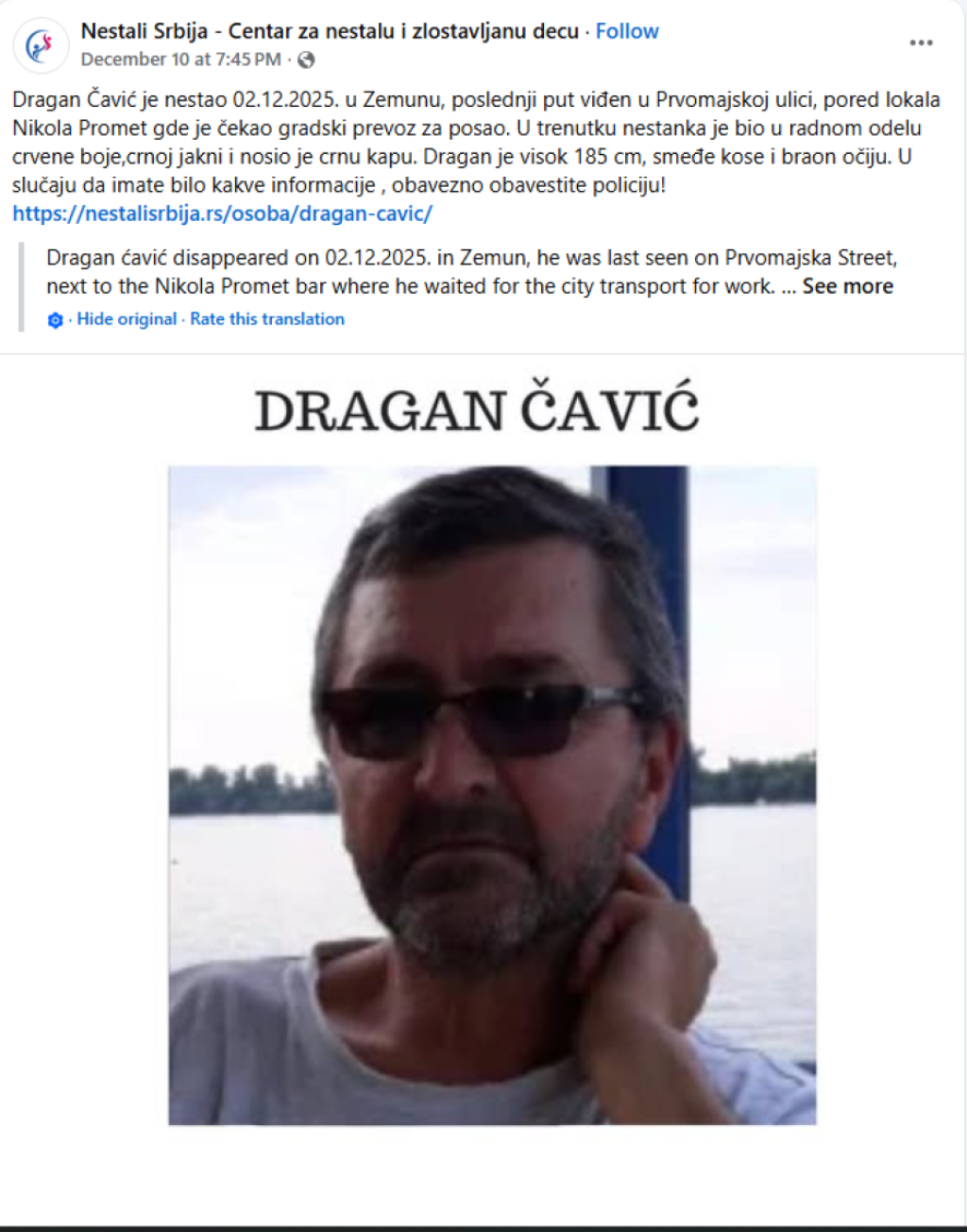 Kako tvrdi Suzana, ona je nestanak Dragana Čavića prijavila 3. decembra u PS Zrenjanin, a oni su u saradnji sa PS Zemun pokrenuli potragu za nestalim muškarcem.