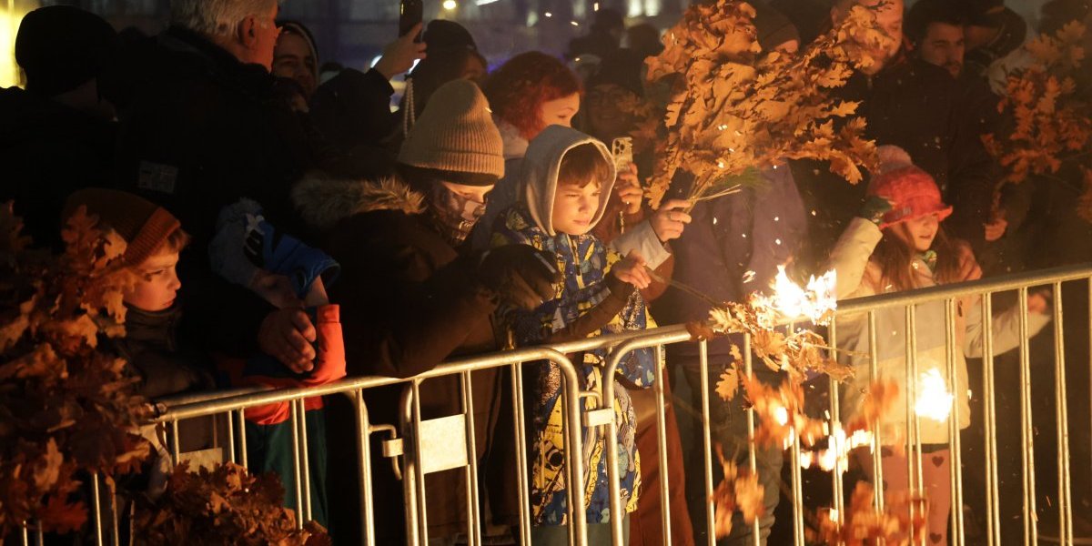 Plamen badnjaka i boje vatrometa obasjavaju nebo nad gradom.