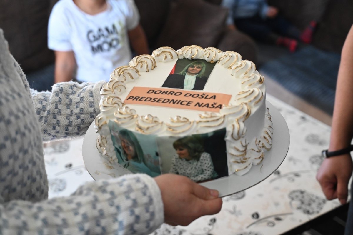 Ali i domaćini su imali poklon za nju. Torta dekorisana fotografijom i napisom "dobro došla predsednice naša" oduševila je gošću.