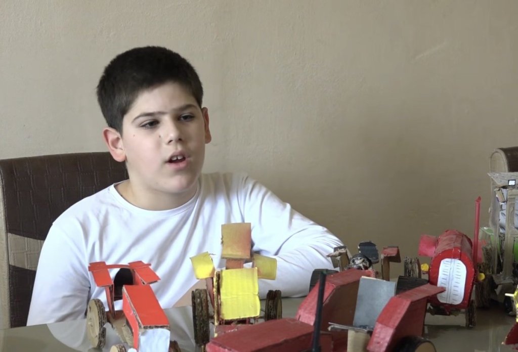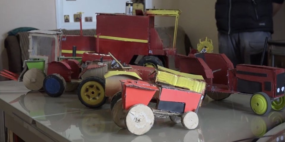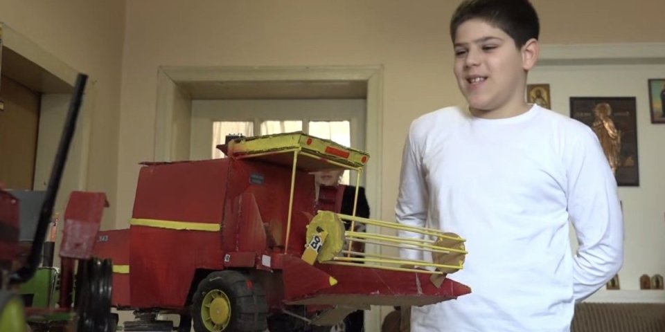Dok većina dece vreme posle škole provodi uz televizore i telefone, Uroš se bavi kreativnim radom. Njegovi alati su osim volje i talenata, spretne ruke, makaze, lepak i najvažniji – karton od koga su makete poljoprivrednih mašina i napravljene.