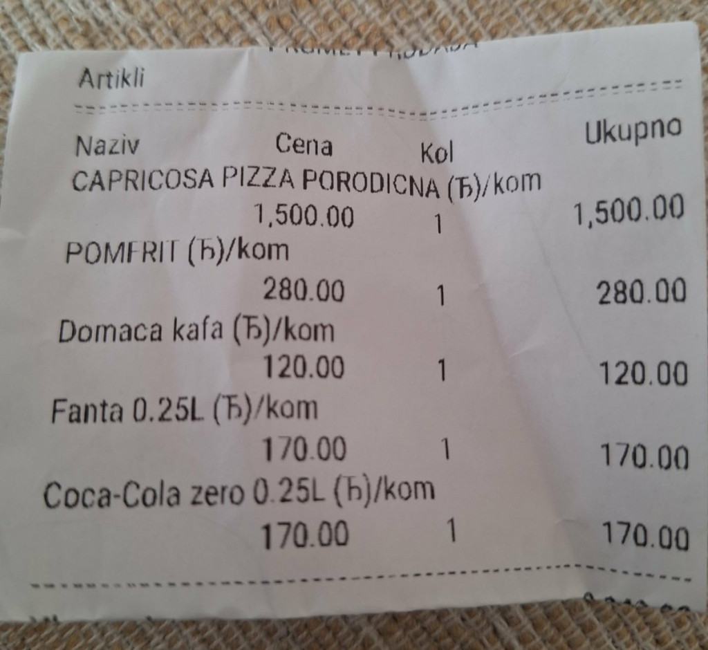 - Večera za četvoro - porodična pica i četiri soka, a sasvim smo bili siti, koštala je tek nešto više od 2.000 dinara . U odnosu na cene u Nišu to je sigurno upola manje, a u odnosu na cene u Beogradu i više - kaže Nišlija.