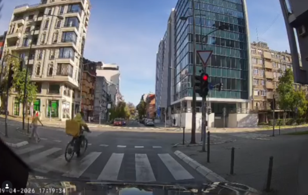 Na snimku koji je nastao juče, 19. aprila 2026. godine u 17:19 časova, jasno se vidi trenutak kada dostavljač sa prepoznatljivom žutom torbom, bez trunke oklevanja, prolazi kroz čisto crveno svetlo na semaforu.