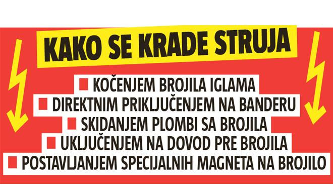 - Neki od najčešćih modela krađe su blokiranje brojila iglom, direktno priključenje na banderu, kao i krađa uz pomoć specijalnih magneta "šokatora", zbog čega merači prikazuju da je potrošnja struje daleko manja od stvarne. U poslednje vreme struja se sve češće krade sa bandera, na koje se direktno priključuju najveći potrošači - kotlovi, termoakumulacione peći i drugi uređaji i mašine. Monterske ekipe to dosta lako otkrivaju, ali često dolaze i po prijavi komšija - objašnjavaju u "Elektroprivredi".