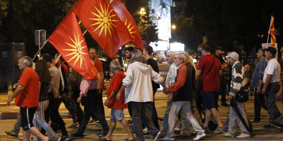 Građani su nosili makedonska nacionalna znamenja i pevali patriotske pesme, a protest je najavljen i za sutra uveče.