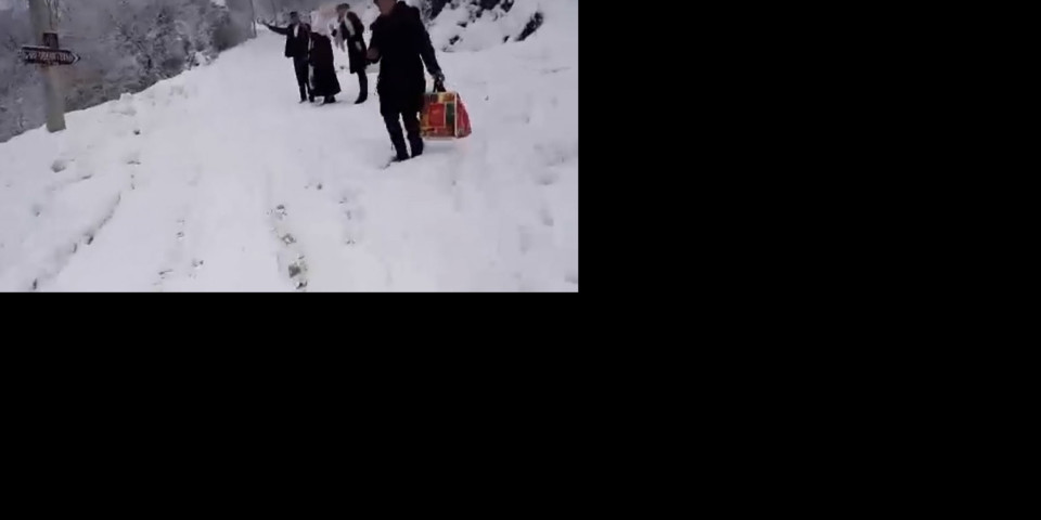 Bajkovit dolazak na venčanje, mladenaca i svatova, uskim putem usred snežne idile ovekovečio je prijatelj mladenaca, Željko Stevanović.