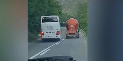 Na snimku pogledajte kako autobus novopazarskih registarskih oznaka na punoj liniji, u krivini, pretiče cisternu.