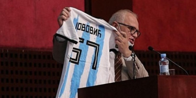 Vesić je na sednicu doneo majicu koju je pokazao odbornicima na kojoj je napisano “Jovović 57 Argentina” i naveo da je to danas najprodavanija majica u Beogradu.