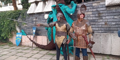 Dva mladića obučena kao vitezovi i sa mačevima za pojasom prikazali su kako su izgledali vitezovi. Iza leđa im je stajao zmaj, delo mlade umetnice iz Kruševca.
