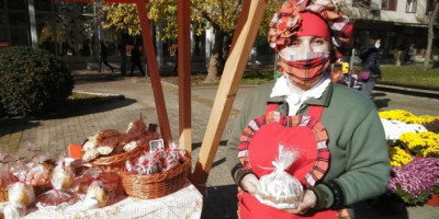 - Sada sam Gopođa Jesen, dobro mi došli na moju tezgu-kao i uvek vesela i puna optimizma dočekuje radoznale prolaznike Smiljana Ratko-U ponudi imam galete, slane i slatke, ušećerene breskvice, kugofe svih veličina i raznih ukusa, kitnikeze, velike i male, upakovane dunje-pa izvolite, probajte-govori kupcima ova vredna domaćica koja se uveliko sprema za Novogodišnji bazar u decembru.