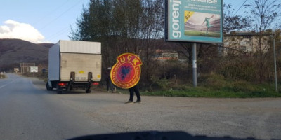 Na mestu gde se nalazio ovaj baner, pored magistrale, sada stoji manja grupa omladinaca koji u rukama drže ambleme OVK.