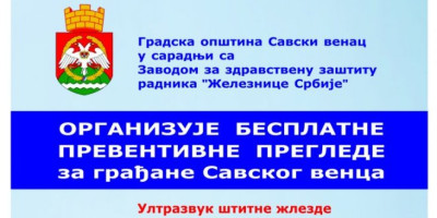 Zavod za zdravstvenu zaštitu radnika „Železnice Srbije“ poziva građane sa opštine Savski venac da iskoriste mogućnost da bez čekanja obave besplatne preventivne ultrazvučne preglede u cilju pravovremenog lečenja, koji će biti organizovani u skladu sa propisanim epidemiološkim merama.
