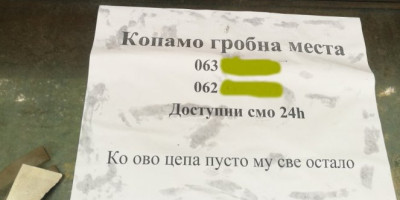 Na belom papiru piše: „Kopamo grobna mesta, dostupni smo 24 sata, a ko ovo cepa, pusto mu sve ostalo!“ Naravno u oglas su upisani i brojevi telefona.