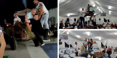 Tako su na ovom slavlju pod šator prvo "uterali" stara zaprežna kola na koja su popeli pevačicu, a onda je sve to začinio domaćin sa svojim drugarima pa je pod šator ušao traktorom na koji je bila nakačena kašika, a u njoj nekoliko momaka.