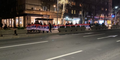Okupljeni su nosili zastave Srbije i veliki transparent na kom piše "Kosovo je srce Srbije".