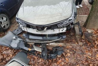 Uništena je prednja maska, farovi i kompletna plastika ispod motora i plastična oplata na krilima automobila. Oštećeno je kvačilo i prednja guma na automobilu.