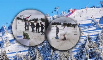 - Svadbena svita koju su činili mladenci, njihovi roditelji, kumovi i svi svatovi koji znaju da skijaju krenula je sa vrha, a potom se zastavila na polovini staze gde se održalo građansko venčanje, i na kraju su se spustili do podnožja gde je žurka nastavljena, kaže za RINU pevač koji se našao na ovom neobičnom veselju.