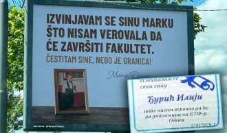 Poruka na bilbordu u Bulevaru kneza Aleksandra Karađorđevića, na Dedinju, već nekoliko dana privlači pažnju prolaznika. Mama Dijana izvinjava se sinu Marku što nije verovala da će on završiti fakultet, a pre nekoliko godina, istim tekstom, tata Ilije Đurića, čestitao je svom sinu na diplomi inženjera elektrotehnike specijalnim oglasom u "Politici"...