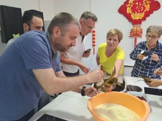 ugostio i svoje radnike i prijatelje iz Srbije. Upoznali smo se sa njihovim običajima koji prate ovaj praznik i na licu mesta gledali kako se pravi "zongzi" koje veoma podseća na naš specijalitet...