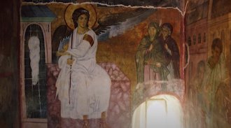 Na fresci je predstavljen arhangel Gavrilo raširenih krila, obučen u beo hiton kako sedi na velikom kamenu i usplahirenim ženama prstom ukazuje na Hristovog grob. Deo je kompozicije "Mironosnice na Hristovom grobu" i smatra se da je delo nepoznate grupe grčkih ikonopisaca.