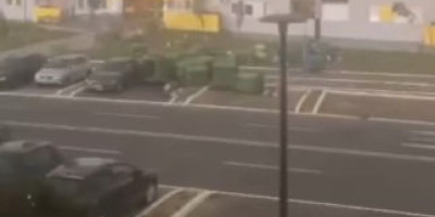 Kako se vidi na snimku, vetar je nosio više od 10 kontejnera. Reč je o zelenim, plastičnim kontejnerima, a vetar ih je nosio kao od šale.