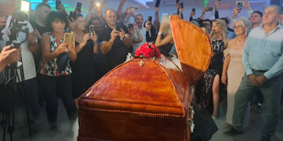 Uz posmrtni marš "Pogrebnog orkestra" iz Beograda uneta je torta od metar i po, teška oko 50 kilograma u obliku mrtvačkog sanduka.
