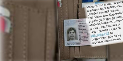 - Malopre kod Ureda (centar Kragujevca), na ulazu u autobus br. 3 za Bresnicu...Ukraden novčanik starijoj ženi. Video sam džeparoša i pojurio ga, stigao ga i uzeo mu novčanik! Nažalost, gospođa je ušla u autobus. Ako je neko zna neka mi se javi (ostavio je i svoj broj mobilnog telefona u objavi) da se dogovorimo gde da joj uručim novčanik - napisao je ovaj Šumadinac u objavi u kojoj je postavio i fotografiju lične karte i novčanika gospođe Mirjane S.