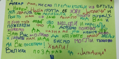 Mališani grupe "Jagodica" uz pomoć svojih vaspitačica, napisali su "zvanično" pismo Muzeju s molbom da im omoguće posetu jer su već, kako su napisali, dva puta već dolazili i mnogo im se dopalo.