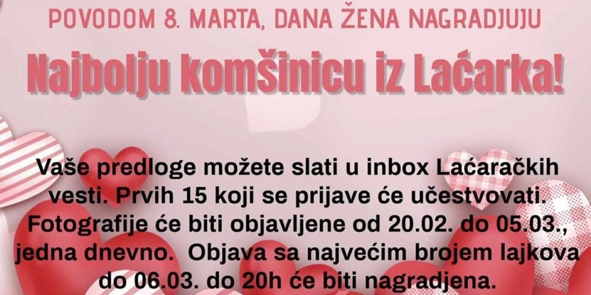 Zanimljiv predlog lokalnog portala Laćaračke vesti odlično je prihvaćen a svakog dana pristižu predlozi...Ideju za izbor najbolje komšinice pokrenuli su kreatori portala Darko Kiki i Milan Mijat sa sponzorima povodom predstojećeg Dana žena.