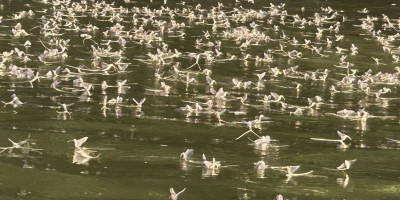 - Temperature ovog proleća bile su izuzetno visoke, od 25 do 30 stepeni, što je pogodovalo larvama Tiskog cveta koje žive tri godine u mulju, na dnu Tise. Posle toga izlaze na površinu i tada izvode svoj svadbeni let parenja - kaže Jožef Gergelj, biolog-ornitolog sa kojim je naša ekipa zabeležila ovaj fenomen.