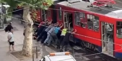 Ništa čudno, ali ono što je prolaznike uveliko začudilo je namera nekoliko učesnika u saobraćaju da metalnu grdosiju od nekoliko tona, guranjem vrate na šine