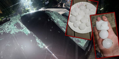 Uprkos tome sručio se krupan grad veličine oraha i teniske loptice i za kratko vreme pričinio značajnu štetu.