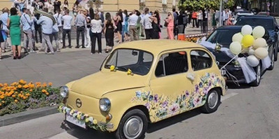 Dok su u svadbenoj pratnji bili "besni" automobili, mlada Emilija i mladoženja Nemanja Lazić ispred Gradske kuće u Užicu na svoje venčanje došli su u žutoj "fići", staroj skoro pola veka!
